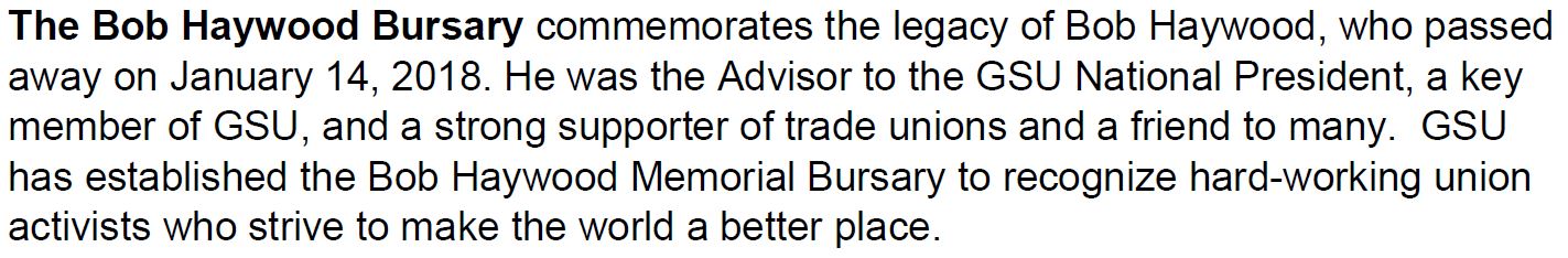 In keeping with its principles, the GSU has established the Bob Haywood Memorial Bursary to honour a hard-working union activist and a man of great conviction who was committed to improving the world in which we live. The bursary is worth $2,000.