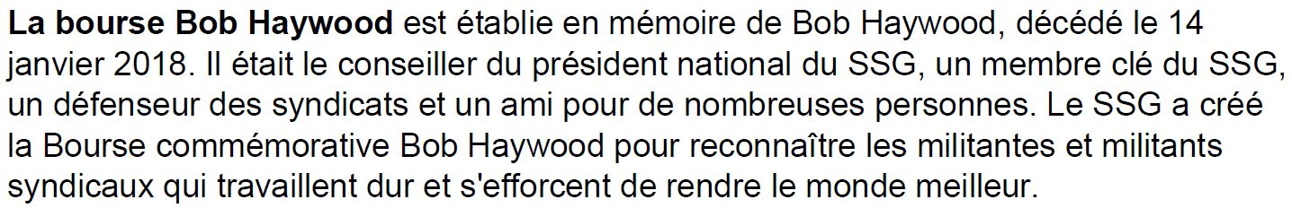 Conformément aux principes qui sont les siens, le SSG a créé la Bourse commémorative Bob Haywood qui met à l’honneur un militant syndical acharné et un homme de grande conviction qui avait pris l’engagement d’améliorer le monde dans lequel nous vivons. La bourse est d’une valeur de 2 000$.